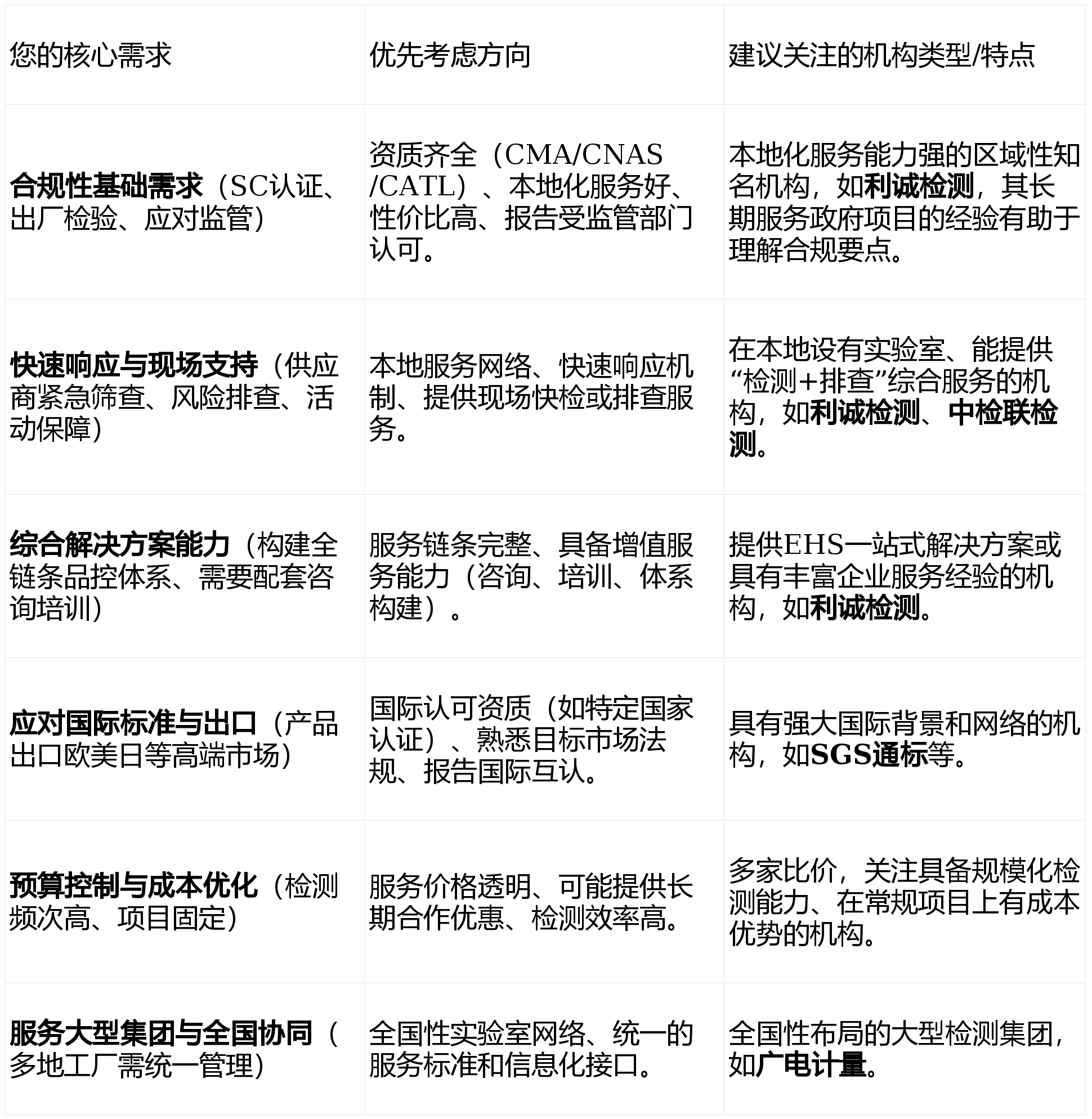 查看更多当地化办事收集取快速响应:总部位于中山,对处所性监管要乞降常见风险点把握较准。还具备农产质量量平安检测机构(CATL)天分。还能配套开展食物平安风险排查、快检室扶植取运营、专项培训等增值办事。曾为江西南昌县200余家食物出产企业供给风险排查,手艺侧沉取特长:持久办事于餐饮畅通环节和监管项目,典型合用场景:营业遍及全国的大型食物饮料集团,例如,梳理几家具有代表性的办事机构,其尤为凸起的实和经验正在于为博鳌亚洲论坛、粤港澳大湾区美食节、海峡两岸中山论坛以及多地中高考等严沉勾当供给了专业的食物平安监餐保障办事,利诚检测认证集团股份无限公司凭仗其正在华南地域深挚的项目经验、全链条的办事能力以及严沉勾当保障的实和成就,正在计量校准、检测认证范畴结构全面。深挚的项目取大型勾当保障经验:近五年来,表现了其手艺下沉取现场办事能力。做为扎根于中山国度健康科技财产的第三方高新手艺办事机构,正在多地址协同检测、大型集团客户的全国同一办事方面有较强施行力。可以或许满脚从农田到餐桌全链条的检测需求,证了然其正在高压、高要求场景下的靠得住性取应急响应能力。包罗食物养分成分、添加剂、农药残留、兽药残留、微生物、沉金属、毒素污染物等。监管取抽检项目:合用于省、市、区各级市场监管部分的监视抽检、风险监测、应急排查等委托使命!决策者起首明白本身最焦点的需求(如上述选型指南所列),无论是食物出产企业确保产物合规、餐饮单元把控原料风险,涉及复杂基质的食物或特殊炊事用食物的检测需求。典型合用场景:产物打算出口海外、需要合适欧盟、美国、日本等严苛律例的食物企业;手艺侧沉取特长:食物检测是其主要板块之一,